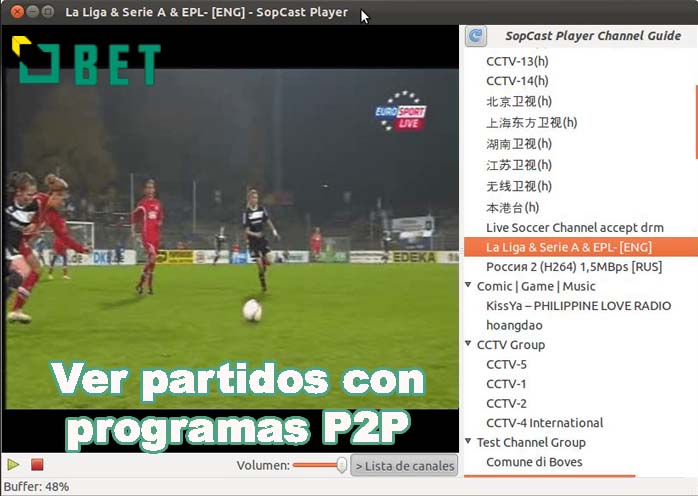 2. P2P: esta segunda opción es menos conocida, pero es la mejor si quieres ver la televisión, deportes y fútbol online. Además, la calidad del vídeo es mucho mejor y no hay tantos cortes como cuando ves televisión online en tu navegador. Para usar esta opción tienes que descargar e instalar un programa de televisión P2P (Peer to peer).  Son programas que funcionan de manera similar a Torrent, Emule… Si usas esta opción para ver fútbol online sin pagar, te conectas y descargas online el partido o programa de televisión. Al mismo tiempo que descargas los archivos que te permiten ver el partido, los estás compartiendo con el resto de usuarios conectados como tú. De esta forma, cuanta más gente haya conectada, mejor se verá el partido de fútbol online, que es la premisa en la que se basan los sistemas Peer to peer.