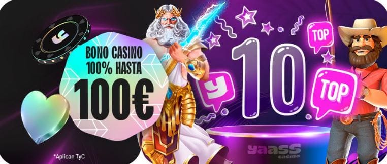 Yaass Casino presenta una promoción exclusiva TOP10 para todos sus usuarios, tanto nuevos como registrados, que permite conseguir el 100% adicional sobre tu depósito. Para activar esta oferta especial, únicamente debes introducir el código TOP10 al realizar un ingreso mínimo de 30€. De esta manera, el casino online te otorgará automáticamente hasta 100€ extra para disfrutar en sus juegos de tragamonedas y ruleta en vivo.